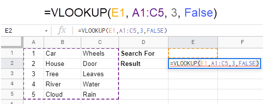 The VLOOKUP function above will use whatever value is in cell E1 as its search key. When it finds a match in column A of the range of cells from A1 to C5, it will look in the third column of the same row as it found the match and return whatever value is in it. The image below shows the results of entering 4 in cell E1. Next, let’s look at a couple of ways to use the VLOOKUP function in Google Sheets.