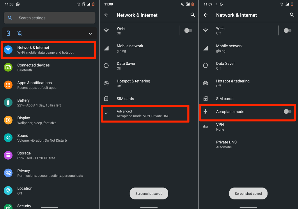 In Android, go to Settings > Network & Internet > Advanced, turn on Airplane mode, and turn it off after 30 seconds.
