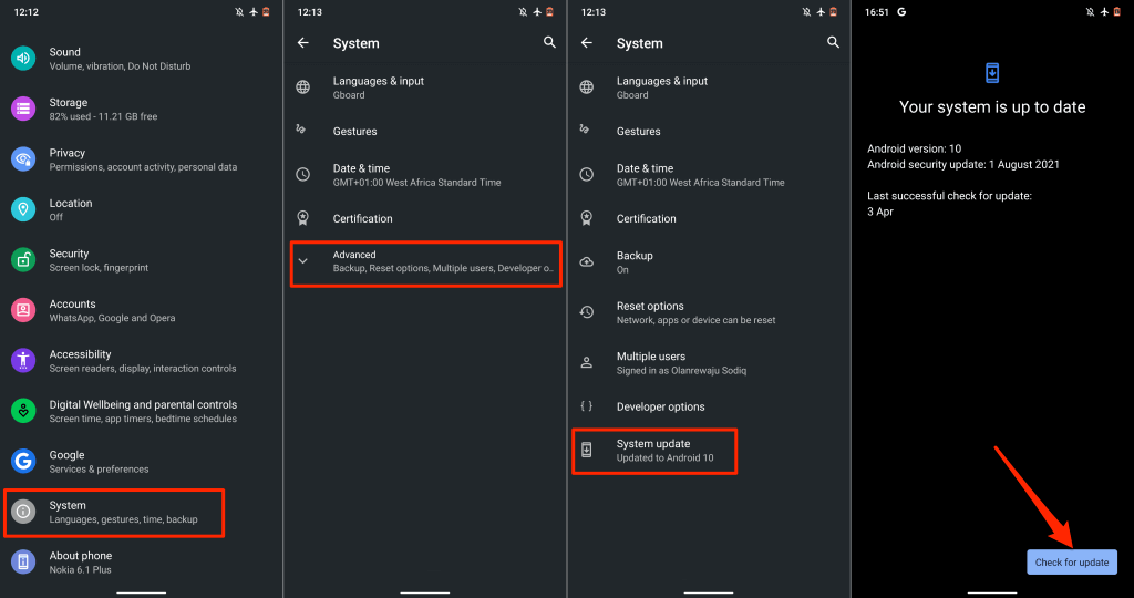 To install an Android update, go to Settings > System > Advanced > System update and tap Check for updates.