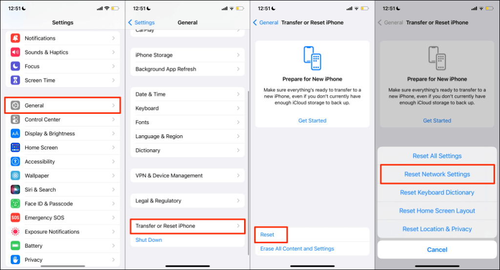 To reset network settings on iPhones running iOS 15 or later, go to Settings > General > Transfer or Reset iPhone > Reset. Select Reset Network Settings, enter your iPhone’s passcode, and tap Reset Network Settings on the confirmation.
