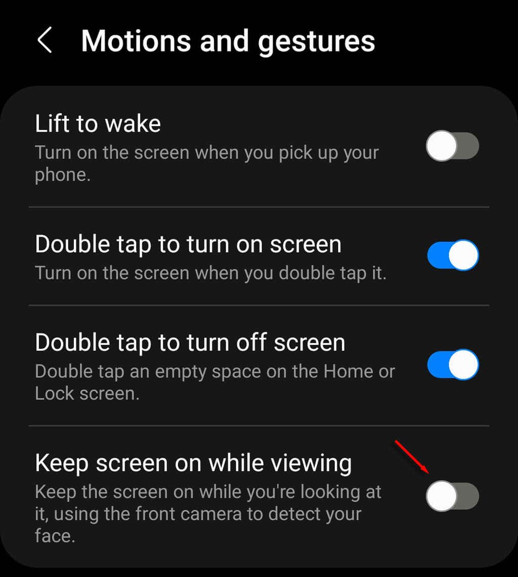 Some Android smartphones, including some Samsung Galaxy models, have advanced motion and gesture settings. One of these settings makes sure your phone screen stays on while you’re looking at it.