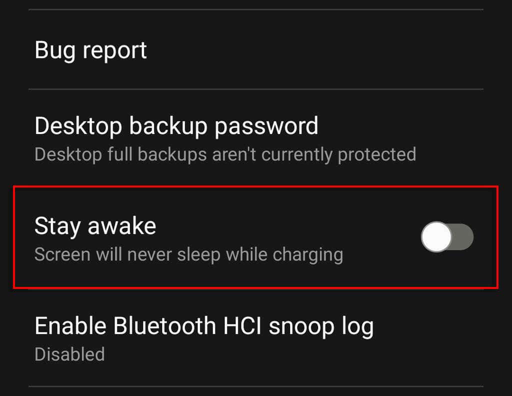 - Toggle on Stay Awake. This will ensure your screen never turns off while connected to a charger cable.
