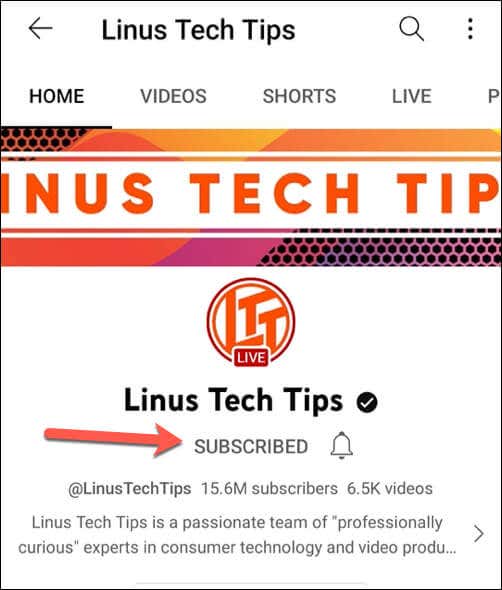- On the channel’s homepage, tap the Subscribed button below the channel’s name.