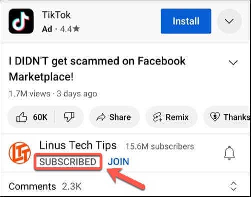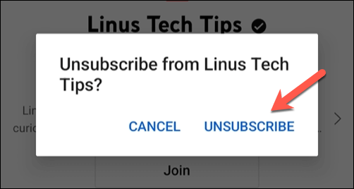 Like PC users, you can also unsubscribe from a channel while you’re watching one of its videos. Below the playing video (outside of fullscreen mode), tap the Subscribed button to remove the subscription—you’ll need to confirm that you want to unsubscribe when you do this.