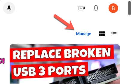 - You’ll see a list of channels that you’re subscribed to and their latest videos. Select the Manage button in the top-right.