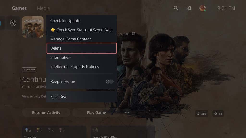 The fastest way to delete a video game on your PS5 is through the Home Screen. Just highlight the game’s thumbnail, press the DualSense controller’s Options button, and select Delete.