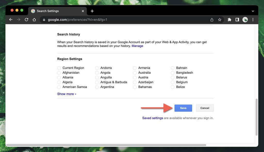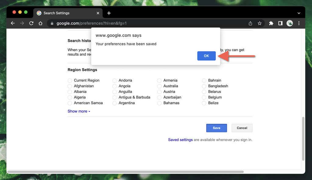 - Select OK on the “Your preferences have been saved” pop-up. You’ll be automatically redirected to the Google Search home page.