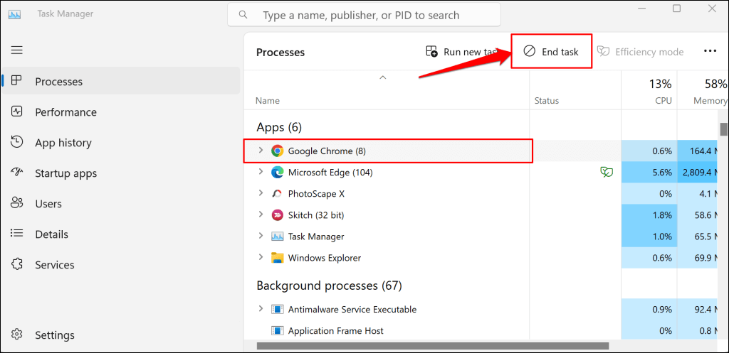 In Windows, open the Task Manager (press Ctrl + Shift + Esc), select Google Chrome, and select End task.