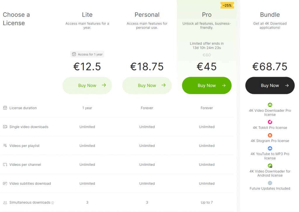 You should know that 4k Video Downloader is not a free app, although you can try it out with a free trial period of 14 days. There are different license options you can purchase for different prices. The choice of a license will affect its duration (one year or lifetime), how many videos you can download, the option to simultaneously download multiple videos, playlist download, subtitle download, and so on.
