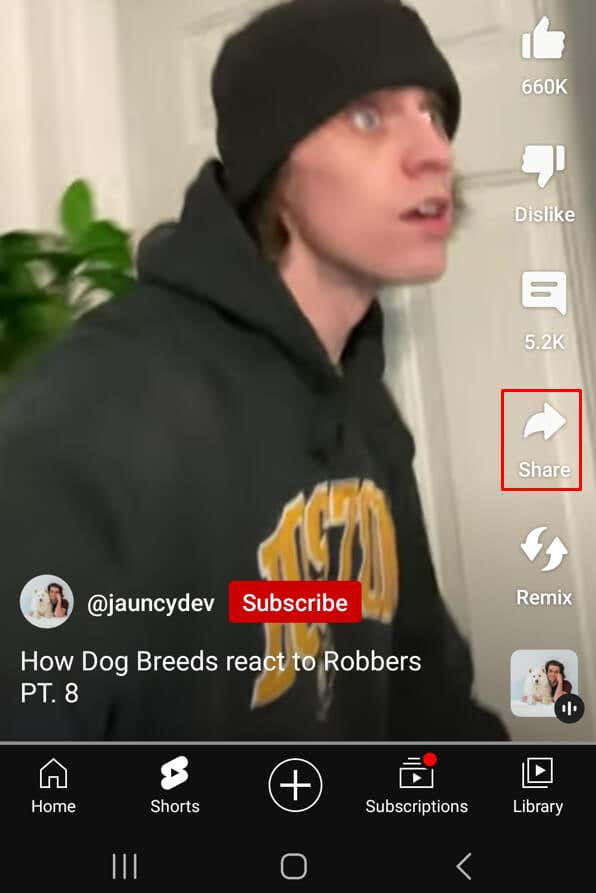 - Open the YouTube app and find the Short you want to download. Click on the Share button to get the link to it.