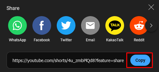 - When a pop-up link window shows up, select the Copy button. This will copy the current Shorts video link.