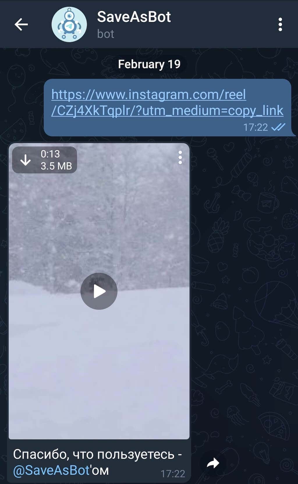 All you need to do is copy the link of the video you’d like to save and paste it into your chat with the bot. You can use the SaveAsBot on both Android and iPhone.