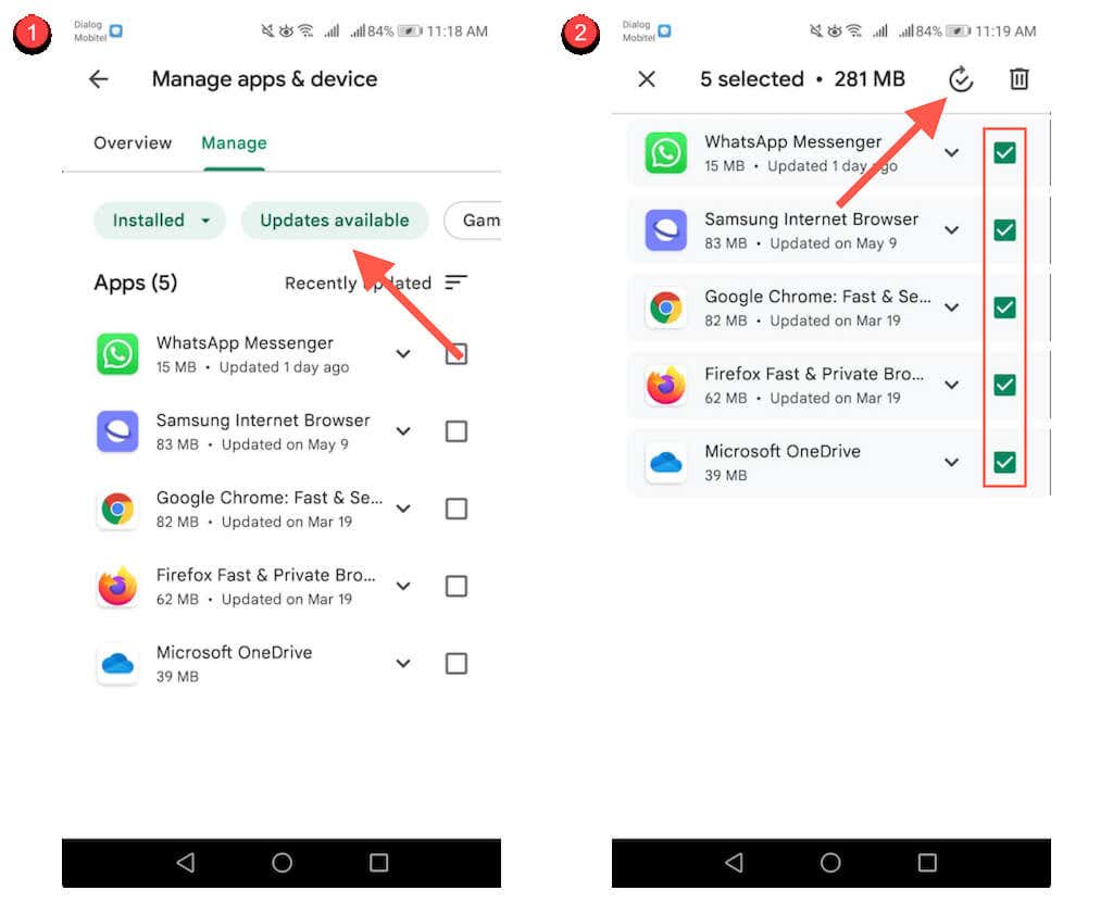 Update multiple apps: Select the Menu icon and select Updates to reveal an updates list. Then, tap the Update icon next to any app to update it. Or, tap Update all to install every update.