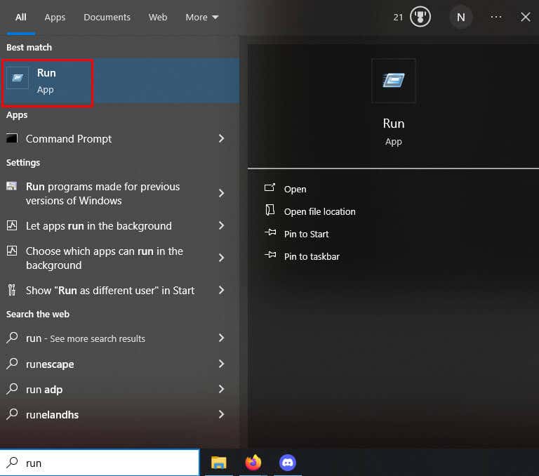 - Type Run in the start menu search bar.