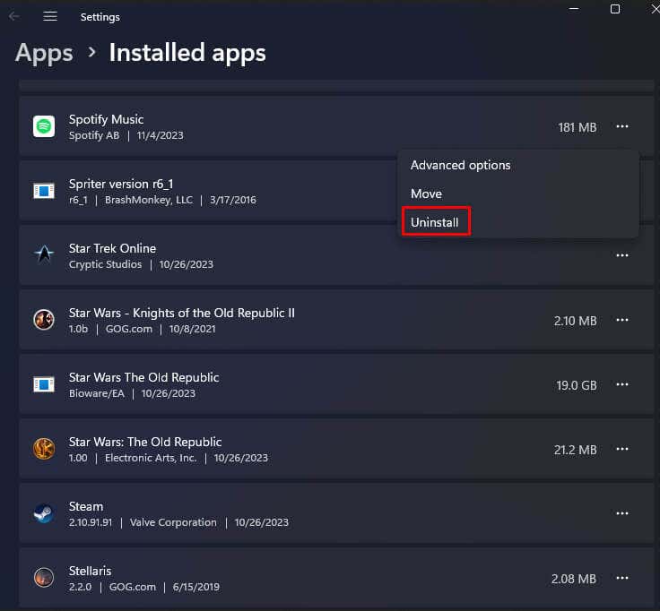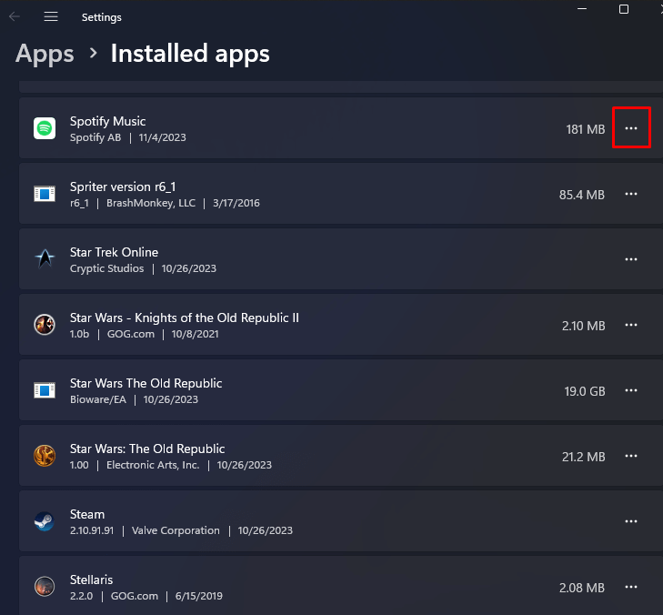 - Find Spotify from the list of apps and click the three dots to open up the menu.