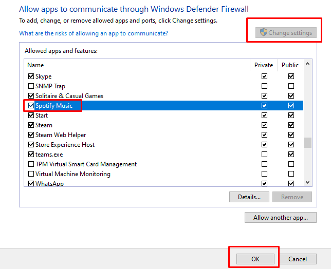 - Click the Change Settings in the upper right corner, then find Spotify on the list of apps and tick the box next to it. Select the OK button at the bottom of the screen to apply changes.