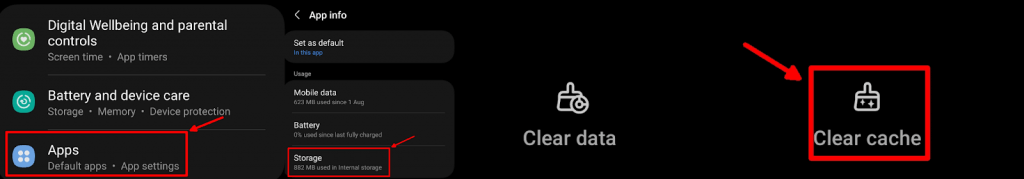 - Tap Storage (or Storage & Cache) > Clear Cache.