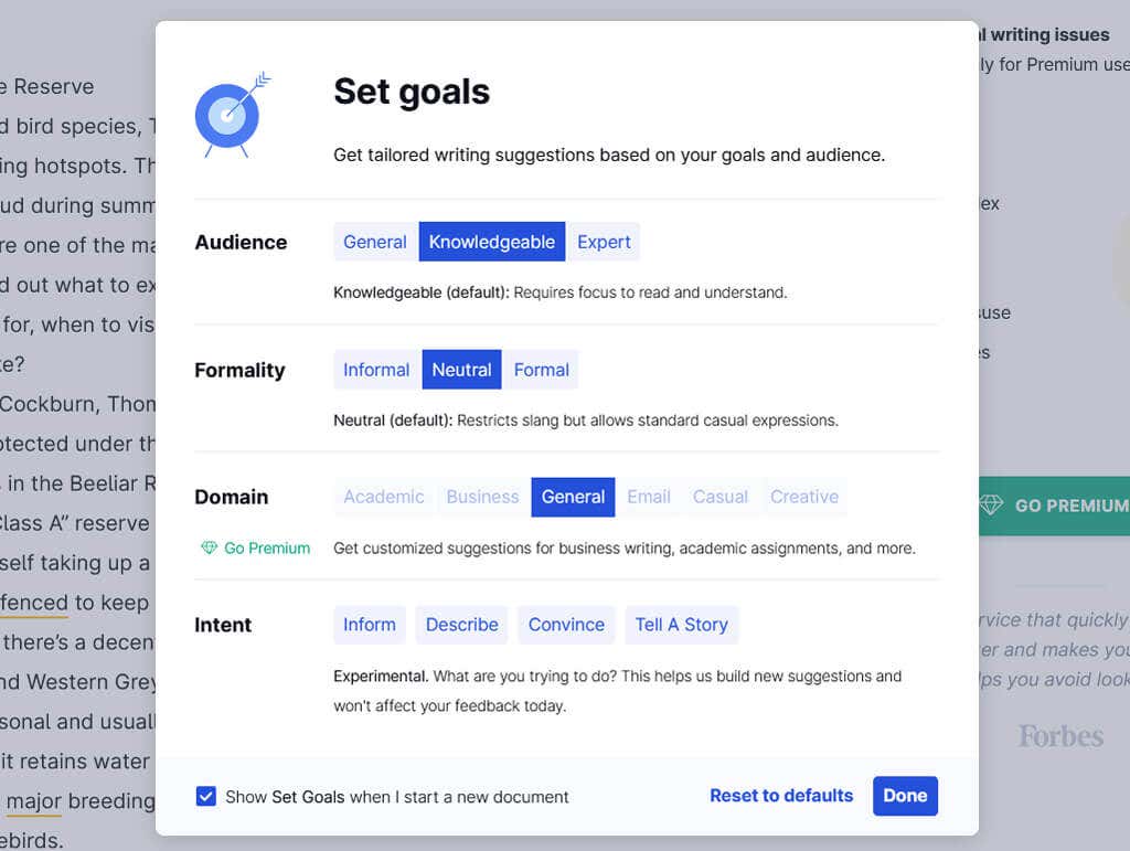 When you open the Grammarly editor, it will ask you to set goals based on the type of text you want to write and the audience that you’re targeting. Based on this, it’ll offer grammatical suggestions that will align your text more with your goals.