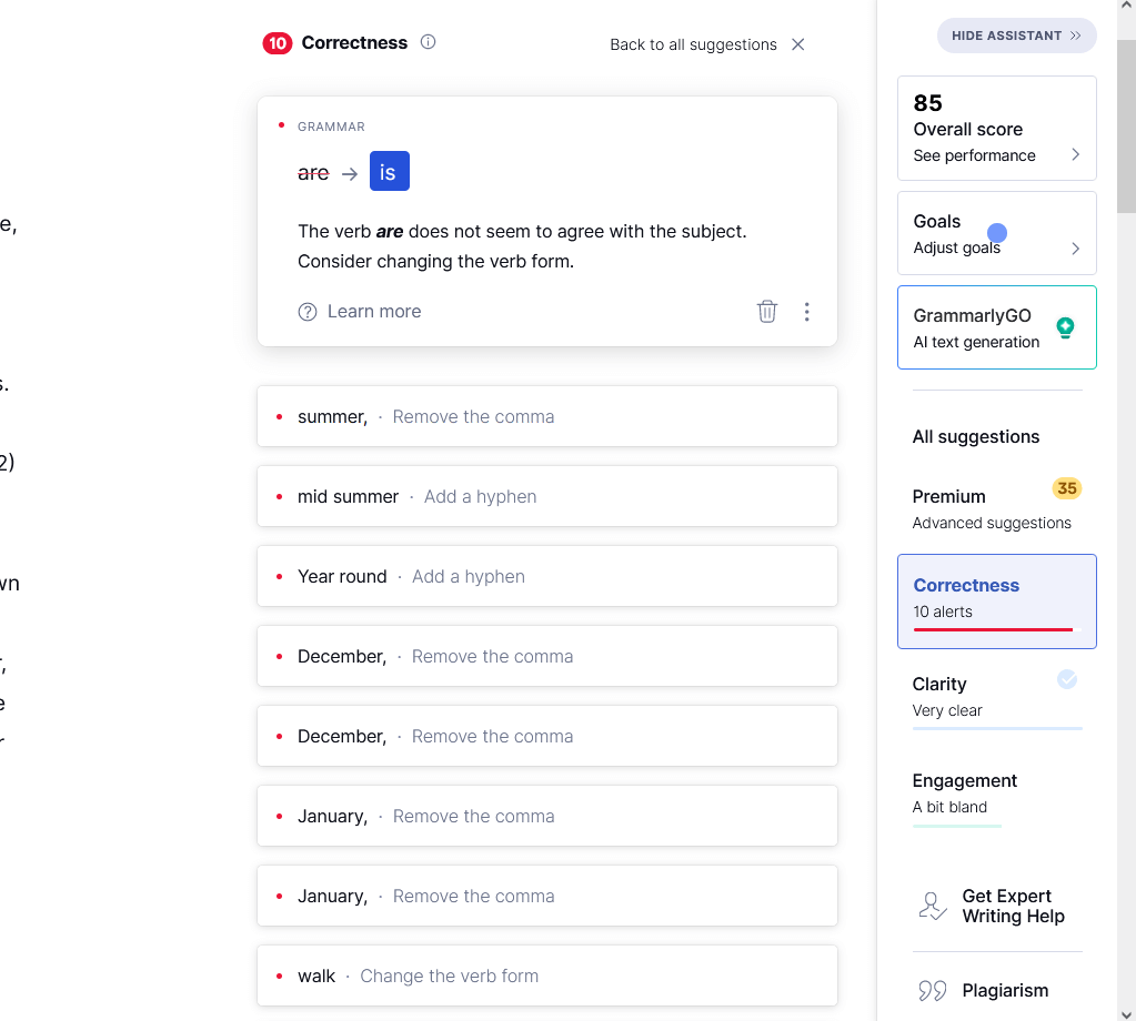 - Target audience corrections. Grammarly will offer suggestions based on four categories (other than correctness): Clarity, engagement, delivery, and style. Imperfect sentences will be underlined in either blue, green, purple, or gray. For each, Grammarly will explain why it’s underlined and suggest changes to improve sentence structure, writing style, and delivery.