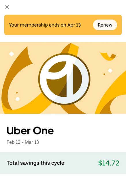 Like many subscription services, an Uber One subscription has an auto-renew policy. That means your subscription will be automatically billed each month or year, depending on your type of subscription. But you can cancel the membership anytime, up to 48 hours before the next billing cycle starts. There are no cancelation fees, and you can activate your membership later.