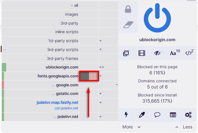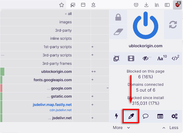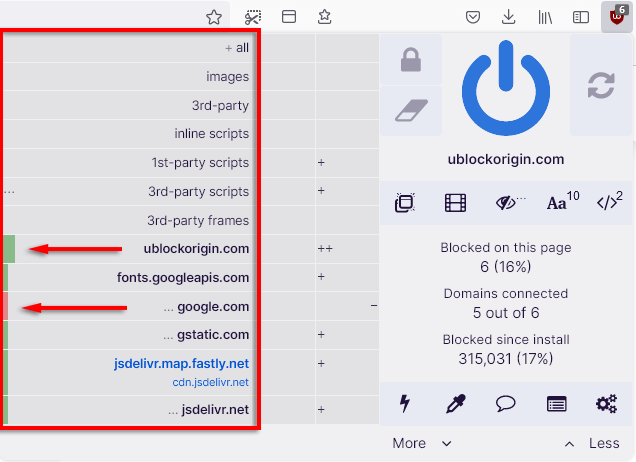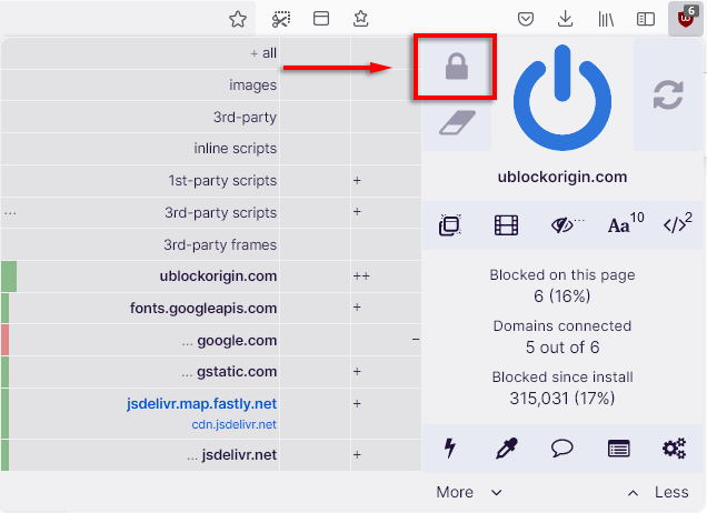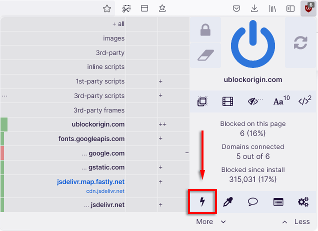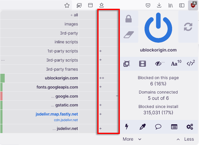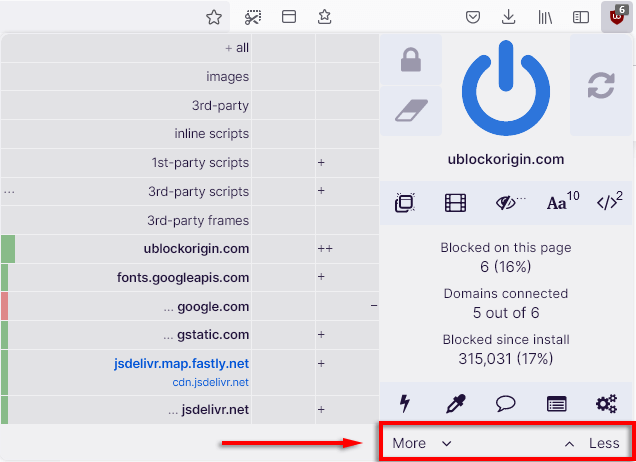 Dynamic filtering allows users to add rules that override static filtering, giving added control over the kind of content that you can block or allow. This can be toggled by clicking the uBO icon and selecting the Less and More buttons.