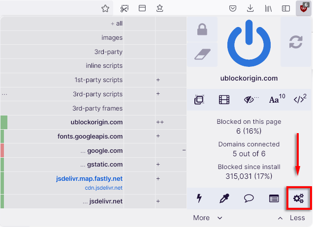 To view these filters, open the uBO dashboard by selecting the cog icon.