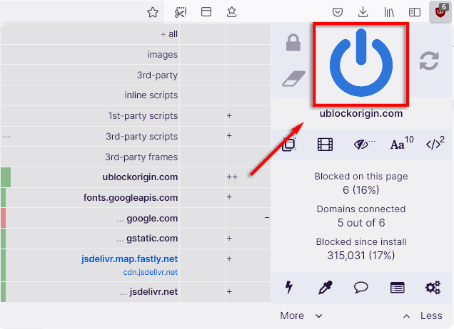 - Click the blue power button to disable uBO on a website or shift + click the blue power button to disable it for an individual page.