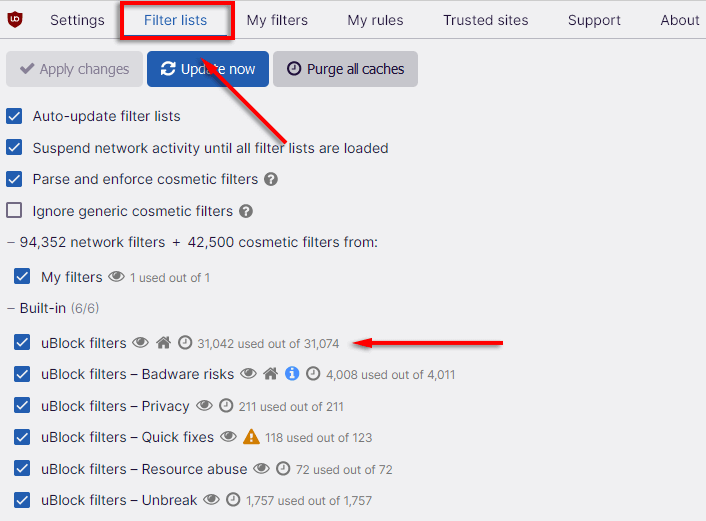 uBO comes with several built-in and third-party filter lists. These can be enabled or disabled at will to increase your privacy online.