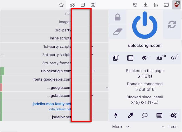 With dynamic filtering enabled, clicking the uBO icon now looks like this: