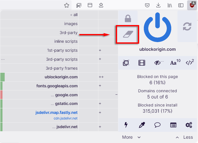 Implementing content blocks will help you achieve maximal privacy but may also cause many websites to break. With this in mind, uBO has made it easy to experiment. You can erase all rules and start again by clicking the eraser.