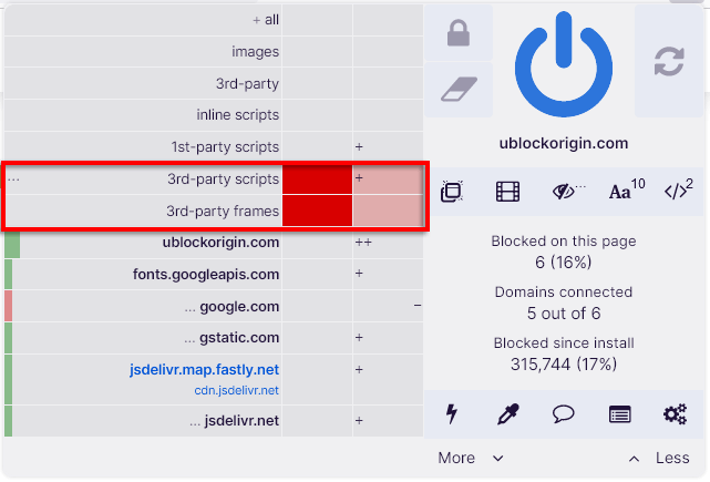 It’s generally recommended to block all third-party frames and scripts globally. These are like embedded “websites within a website” and are often a weak link in websites that malicious actors will target with malware (plus, they’re annoying).