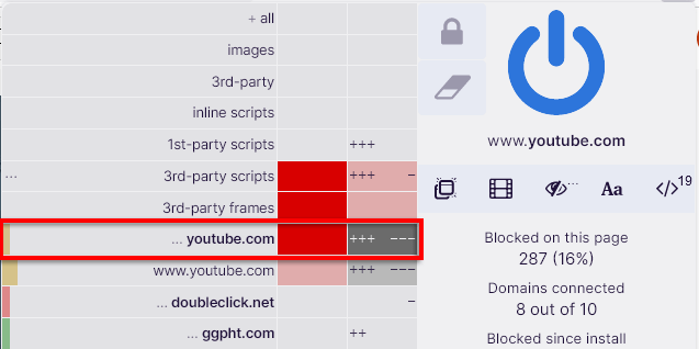 But, say you want to be able to see embedded YouTube videos on a particular website. First, you need to scroll down to the youtube.com URL and click the gray box in the local column. Now, only YouTube third-party frames will load on that site.