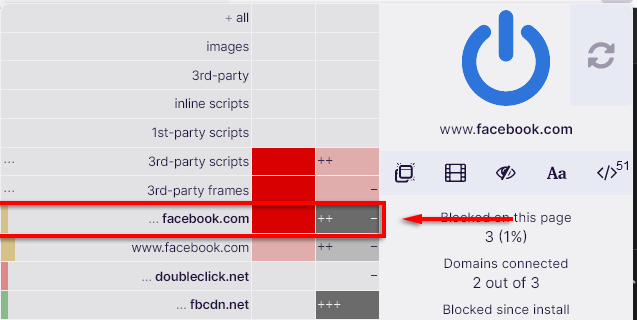 There’s no reason for social media websites or search engines to be able to track your activity outside of their platforms. To block their permissions, open the uBO dashboard and click on the red box in the global column for each social media URL (e.g., Facebook.com). The only problem is that this will also block them when you try to load the website directly.