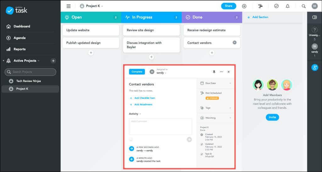 Pricing: Free for up to three projects and then paid subscription plans for additional features, including unlimited projects, recurring tasks, multiple checklists, and more.