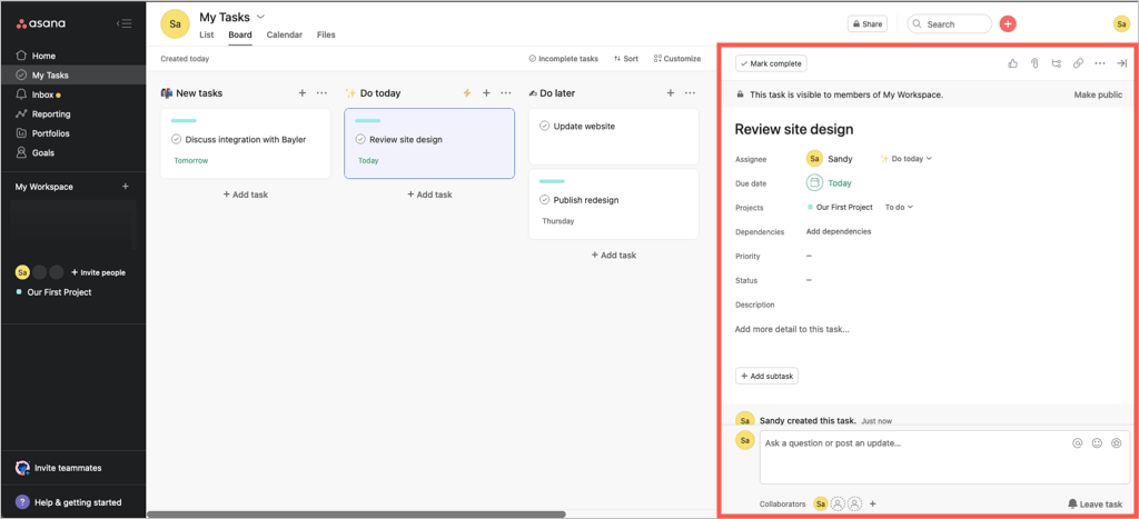 For individuals, you can see your tasks in list, board, or calendar view so that you’re always on top of the next task. Plus, you can add sections for great customization.
