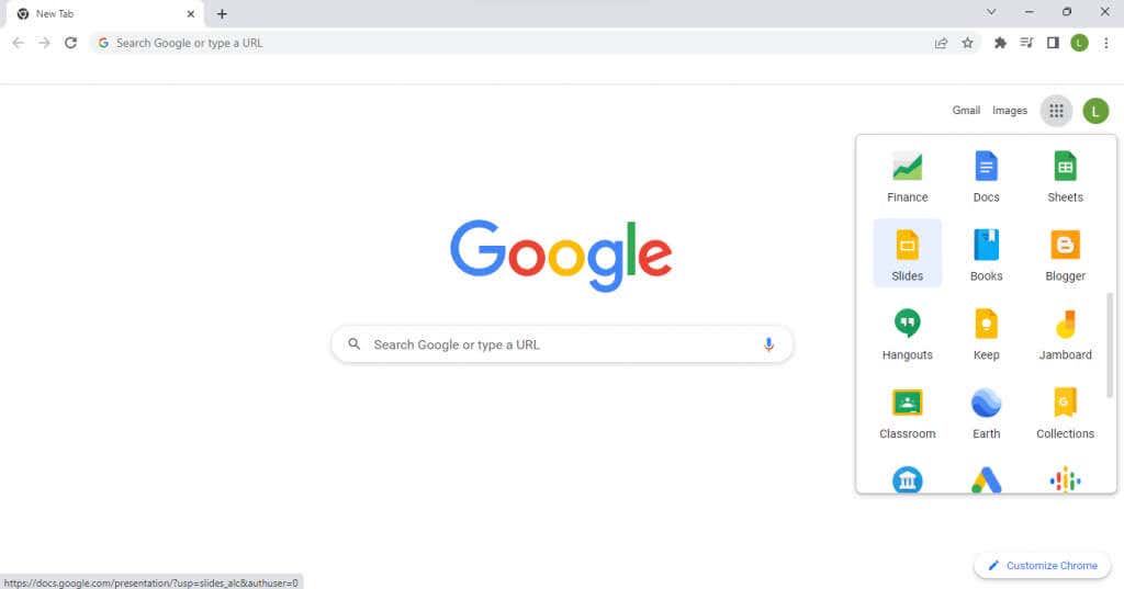 - First, open Google Slides. Just open a new tab on Chrome browser and click on the dots icon next to images. Scroll down this Google apps menu to find Google Slides.