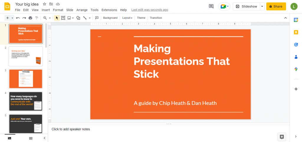 - To keep things simple, we will demonstrate the process in a new presentation created using a template. This gives us a bunch of pre-filled slides to play around with.