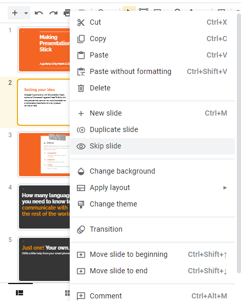 - Let’s say we want to hide a slide in this presentation. Right-click on the slide you wish to hide, and select Skip slide.