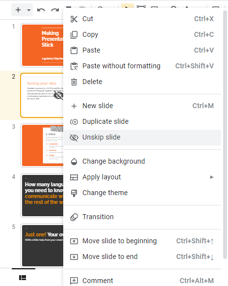 - To unhide the slide, simply right-click on it again. There will be an Unskip slide option in the menu now. Select the option to make the slide visible again.