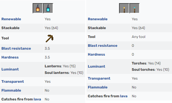 Lanterns look especially great when combined with a lamp post, or in well-decorated interiors. Just like with torches, there is also a soul variant that gives off blue light, though it has a lower light level (10).