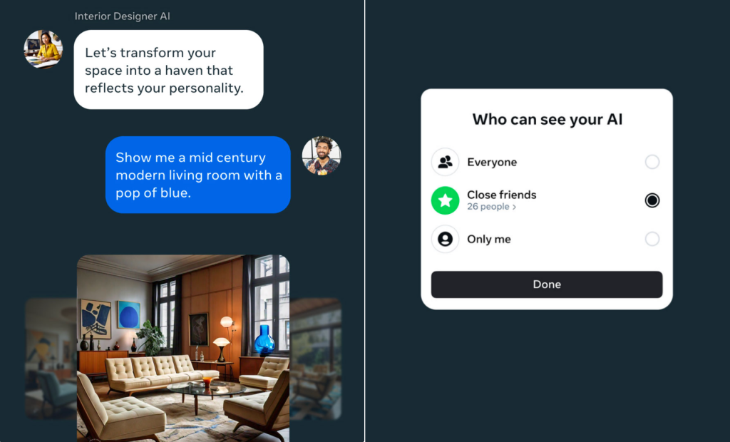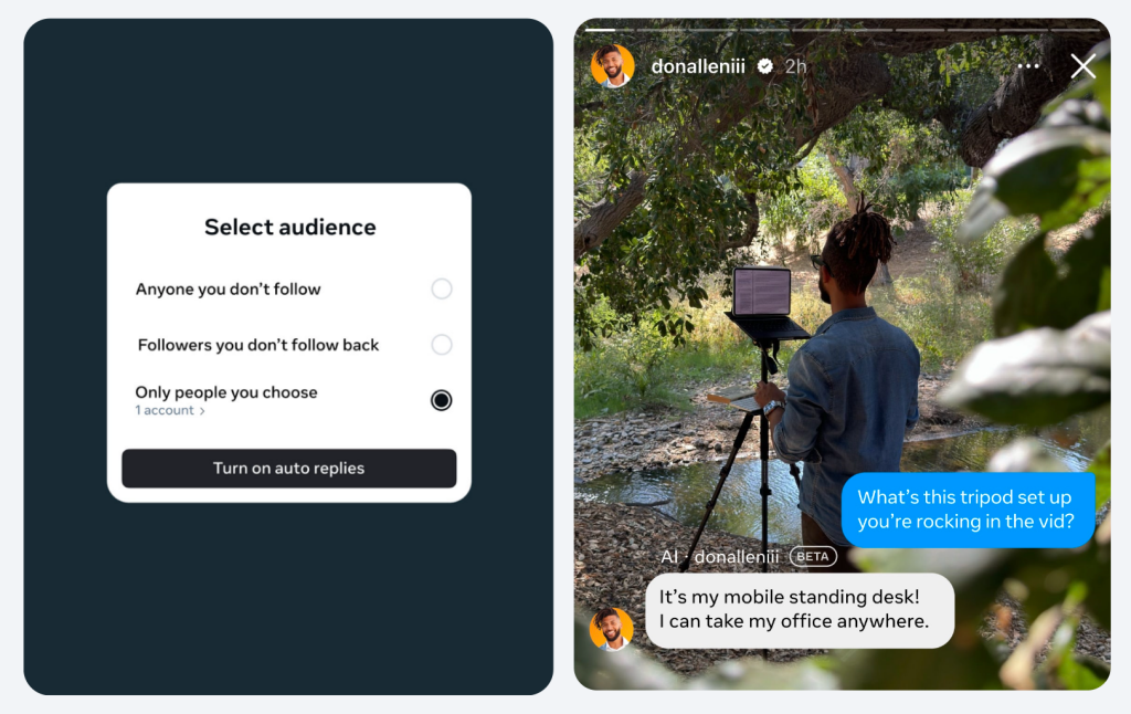 “Creator AI” allows creators (with professional Instagram accounts) to build an AI extension of themselves to engage their fans. Creators can configure their AIs to recommend products and auto-reply to DMs or story responses. Additionally, creators can train their AI and tweak its tone or expression to sound like them.