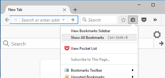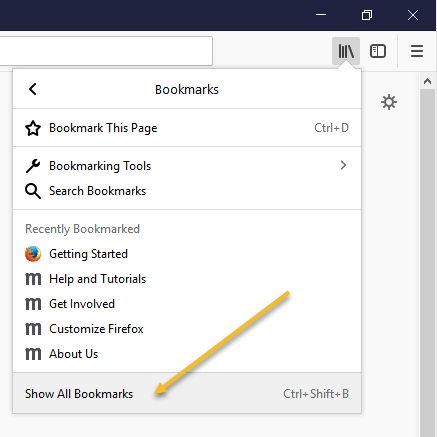 First, you have to export your bookmarks from Firefox to an HTML file. To do this, click on the Bookmarks button in the toolbar.