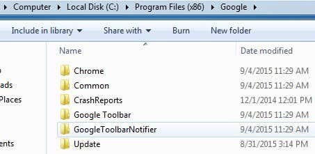 In the newer versions, even though Google Toolbar Notifier does not run as a separate process, it still exists in the folder structure when you install the toolbar. If you go to C:\Program Files (x86)\Google, you will still see the folder there.