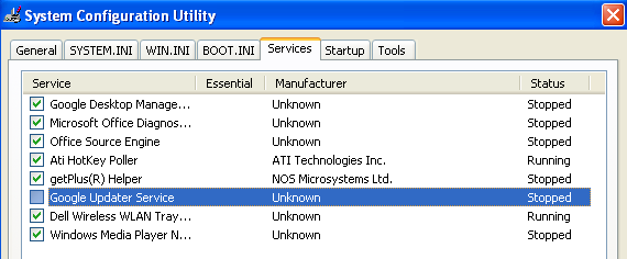 You may also notice the Google Updater service runs all the time too as GoogleUpdater.exe. You can also prevent this process from running by the normal method of going to MSCONFIG, then clicking on the Services tab and unchecking the Google Update Service.