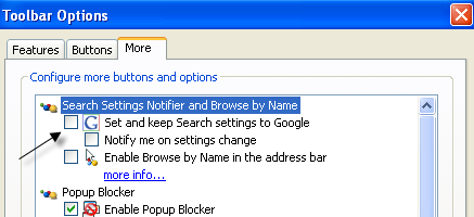 Step 2: Click on the More tab and then uncheck the box that says “Set and keep search settings to Google” under the “Search Settings Notifier and Browse by Name” heading.