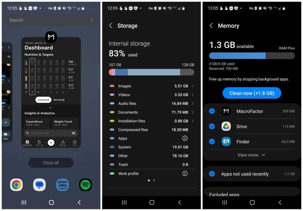The easiest way to do this on an Android phone is by tapping Battery and device care in Settings. Next, tap Storage to see and close which file types use the most space. Finally, tap Memory to see what apps are using your memory, and tap Clean now to close them all.