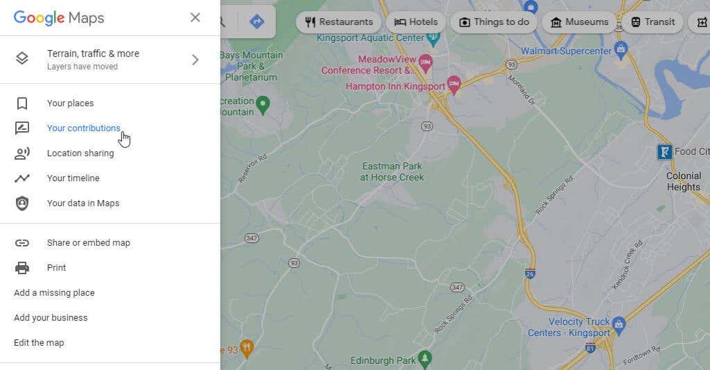 - Log into Google Maps using your Google account, select the menu icon at the upper left, and select Your contributions from the menu.