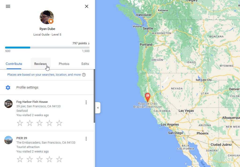 - On the next page, you’ll see a listing of places you’ve recently visited. This is because the Contribute tab is selected by default, and provides you with an option to quickly rate and review businesses you’ve visited. Instead, select Reviews from the menu.
