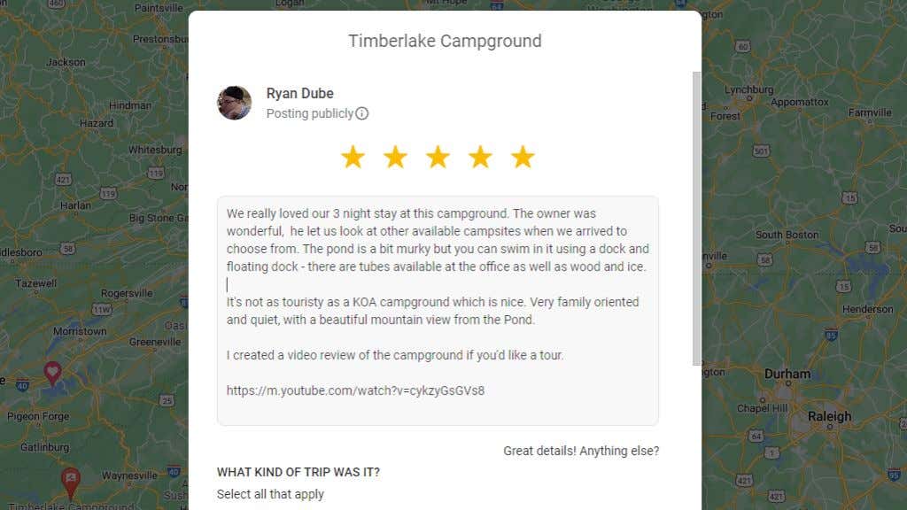 The review form allows you to share a lot of information about your experience with that local business. This includes:
