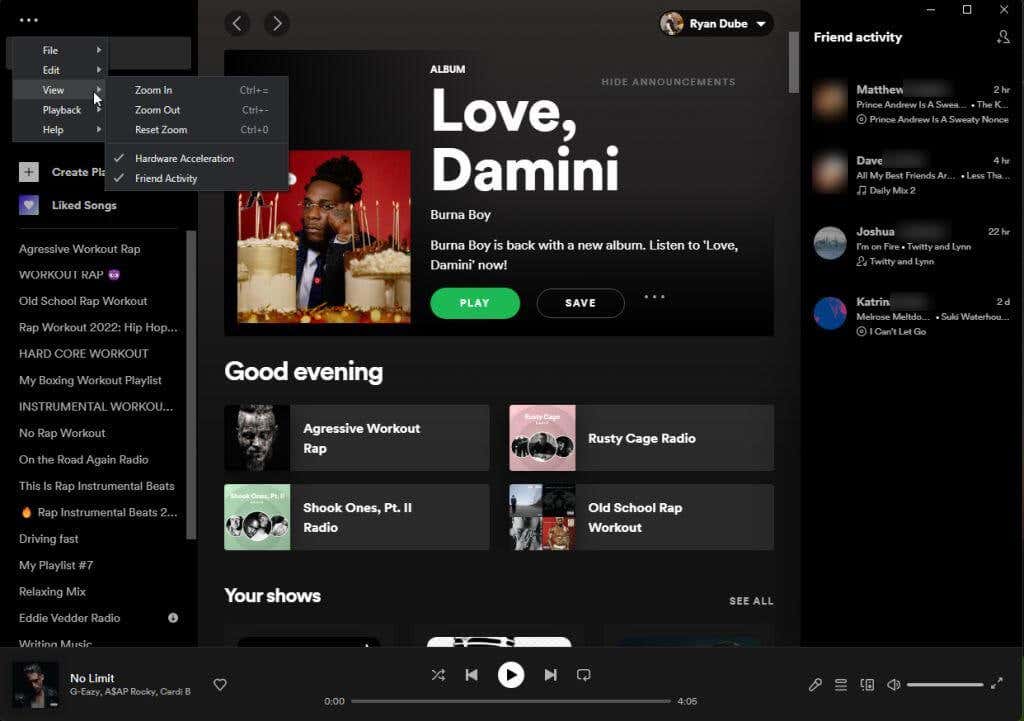 If you have no interest in seeing the Friends Activity pane, you can disable it. To do this, select the three dots at the upper left of the Spotify desktop app, select View from the menu, and select Friend Activity to disable it. You’ll see the checkmark disappear once this feature is disabled.